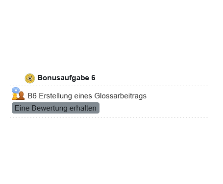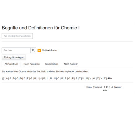 Die im Rahmen einer freiwilligen (Bonus-)Leistung erarbeiteten Definitionen zu wichtigen Fachbegriffen des behandelten Themengebiets können in einem Glossar zusammengefasst werden und den Studierenden zur Prüfungsvorbereitung oder in folgenden Semestern bereits zu Beginn der Veranstaltung zur Verfügung gestellt werden.