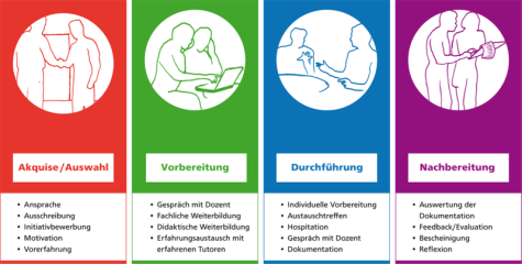 Die Qualifizierung von TutorInnen wird als Prozess verstanden, der sich in vier Phasen unterteilt: Art der Akquise und Kriterien der Auswahl, Vorbereitung, Durchführung und Nachbereitung (vgl. Abb. 3). Wichtig für die Befragung war es, den Qualifizierungsbegriff zu öffnen für mehr Aktivitäten als die reinen didaktischen Schulungen. Damit sollen alle Aktivitäten innerhalb des Fachbereichs zum Qualifizierungsprozess von TutorInnen erfasst werden.