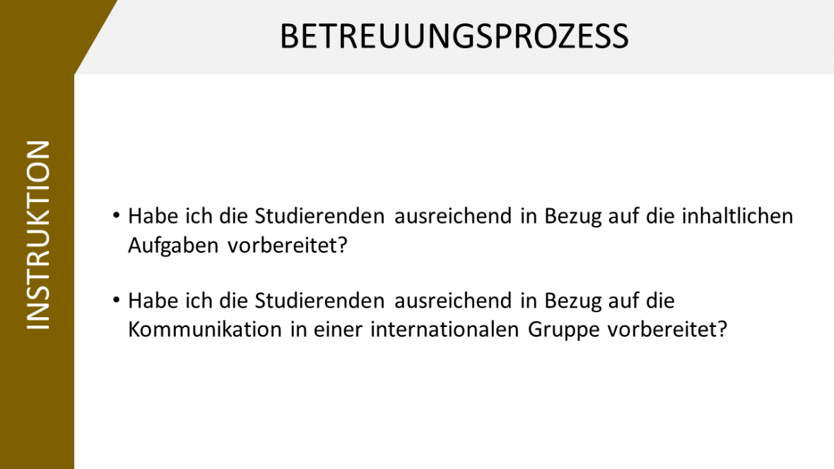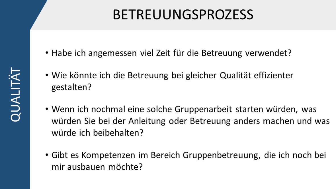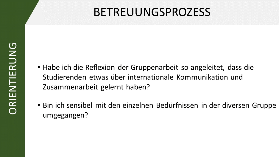 Wenn Sie Lernziele im Bereich Kommunikation und (interkultureller) Kollaboration verfolgen, ist es wichtig den Lernprozess mit einer Reflexion abzuschließen. Mögliche Leitfragen für die Reflexion vonseiten der Studierenden und sich selbst finden Sie folgend.