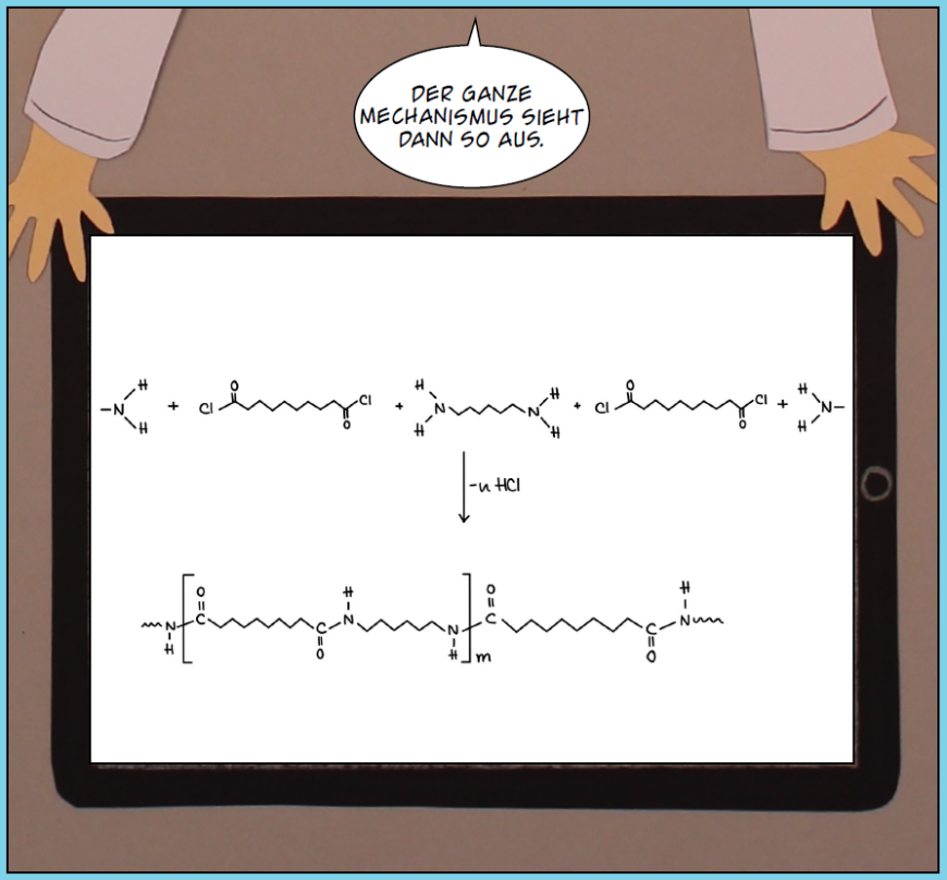 Das Einbinden einer wissenschaftlichen Abbildung in ein Panel (Einzelbild) ist eine elegante Art, wissenschaftliche Informationen in Science Comics unterzubringen. Anschaulicher formuliert: Eine Comicfigur zeigt eine technische Anlage oder chemische Reaktion auf dem Tablet, am digitalen Whiteboard, an der Kreidetafel, als Hologramm usw. (vgl. Max Axiom, Biskup, Martin & Schulz 2011) oder gestattet den Leser*innen einen Blick über ihre Schulter, während sie Tabellen studiert. Im Vergleich zu Infografiken und Informationsboxen, die Panels beigesellt werden, ist an der Strategie vorteilhaft, dass der Lesefluss nicht stark ausgebremst wird. Zudem, und das ist vielleicht der entscheidende Punkt, entsteht kein Bruch mit dem grafischen Stil des Comics. Von Nachteil ist, dass diese Art der Darstellung viel Raum benötigt. Oft sind deshalb nur die Hände der Figuren, die eine Illustration halten, zu sehen.