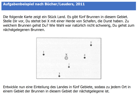 Der gesuchte Begriff in hier Teil einer ungleich komplexeren Problemlösungsaufgabe. Die Problemstellung wurde dabei so konstruiert, dass die lösende Person während der Lösung der Aufgabe auf das Prinzip der „Mittesenkrechten“ gestoßen wird. Inwieweit der Begriff dann auch explizit genannt werden muss, ist wiederum eine Frage des dahinterstehenden Lehrziels, je nachdem, ob die Lösungsprozedur stärker oder weniger stark bewertet werden soll. Die Studierenden sollten im Falle solcher Aufgabe jedoch nicht zu sehr dafür „bestraft“ werden, wenn sie den Begriff nicht konkret benennen, aber ein Verständnis für Konzept und Prozedur zeigen. Der spezifische „Reiz“ einer solchen Aufgabenstellung liegt also darin, dass ein bestimmter Begriff bzw. ein bestimmtes Konzept von den Studierenden „entdeckt“ werden muss und sich an einem konkreten Anwendungsfall plausibilisiert.